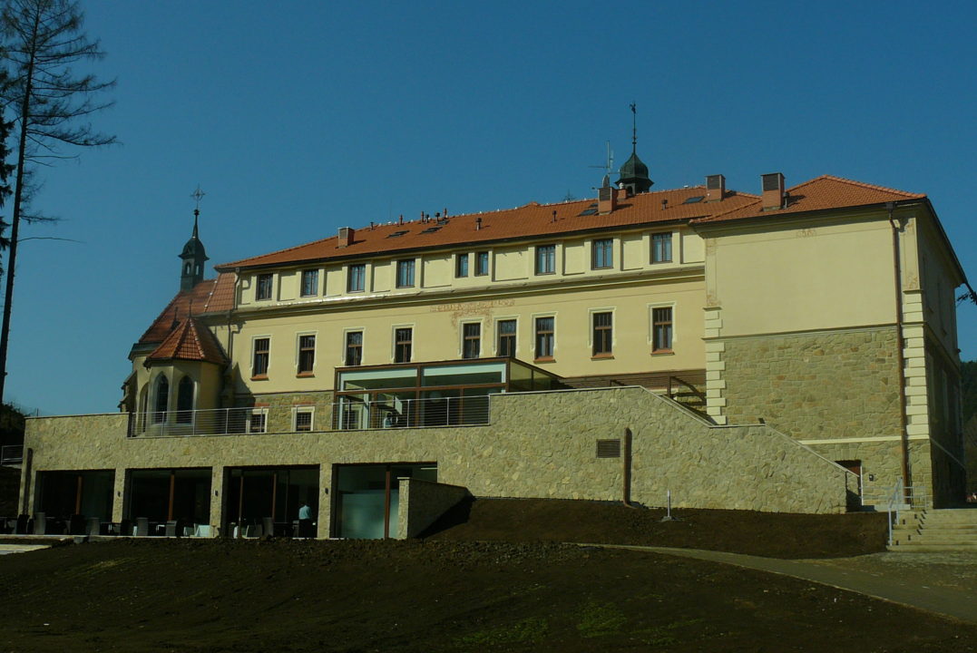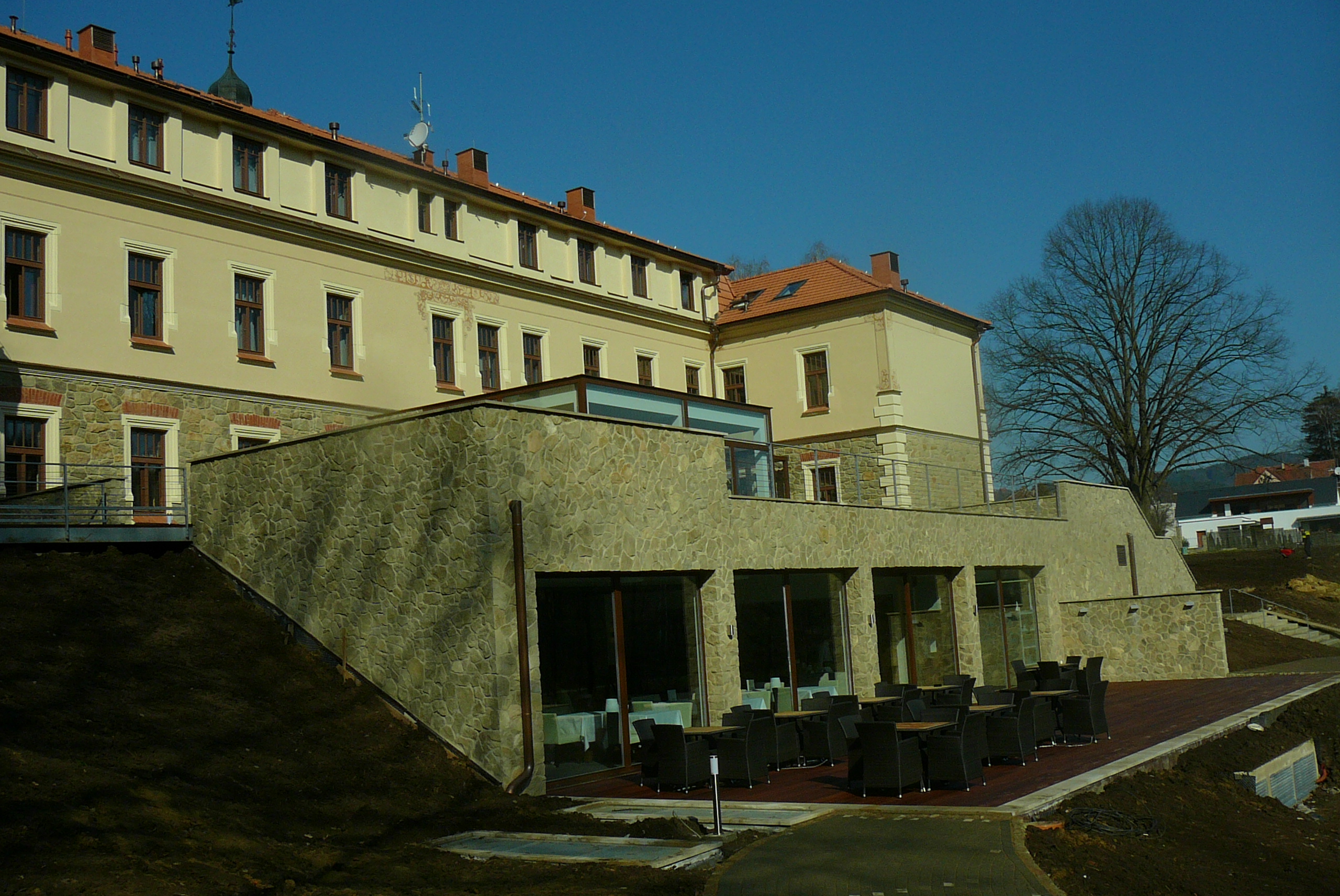 Při rekonstrukci hotelu byli námi realizovány vnitřní i venkovní obklady, podlahy, obklady krbů a recepce.