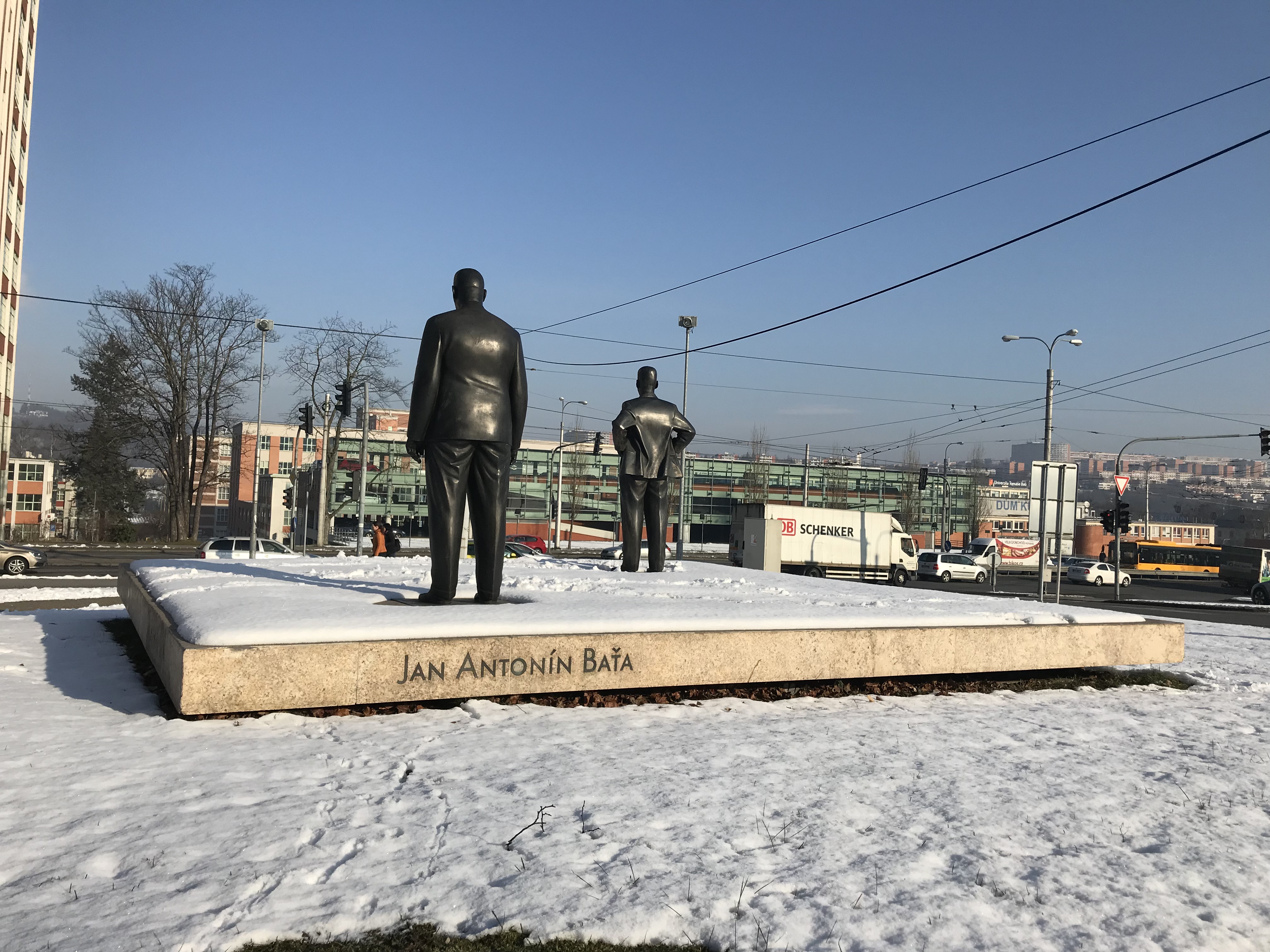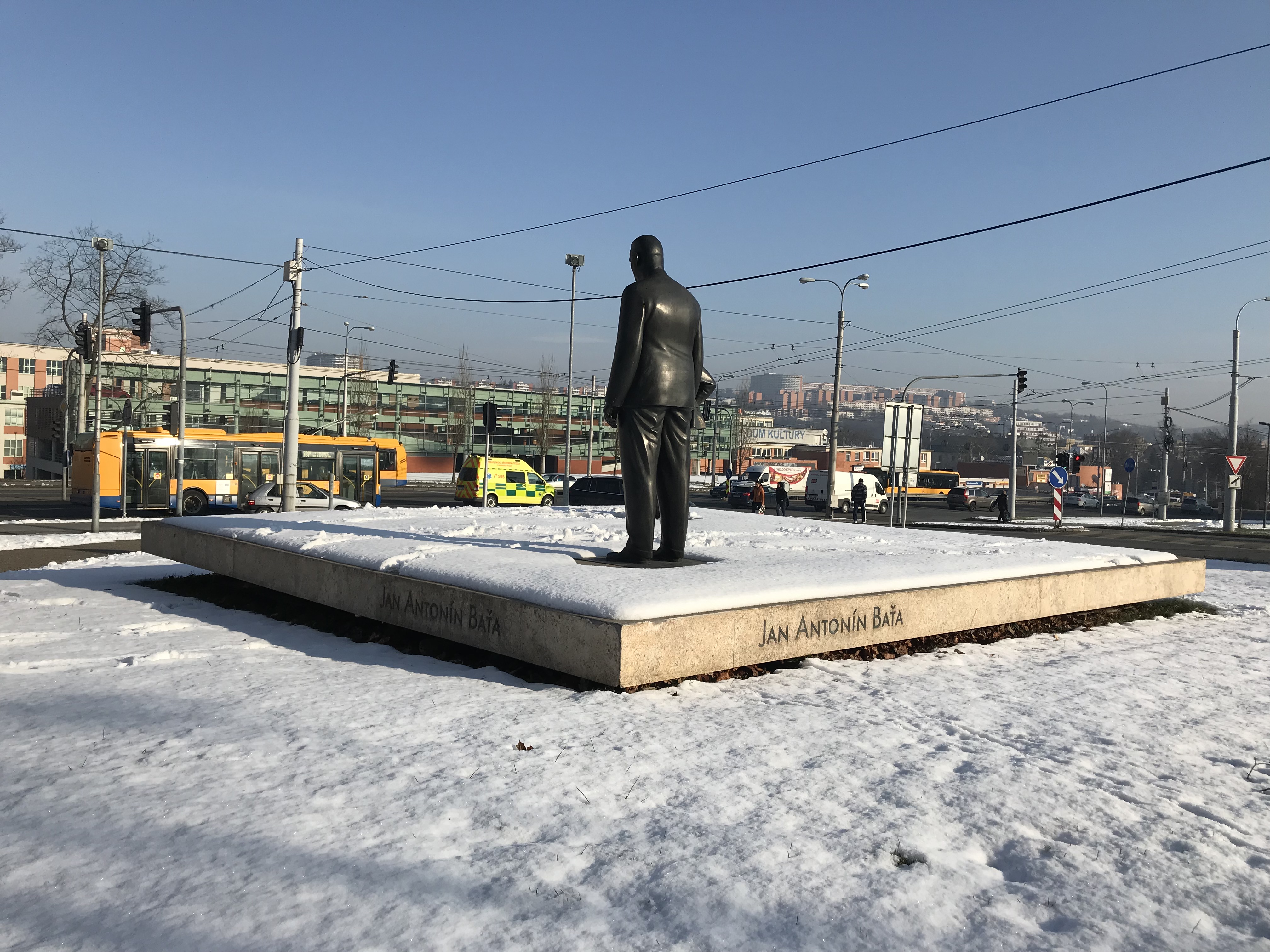 Masivní žulový podstavec pod sochy Tomáše a Jana Antonína Bati ve Zlíně.